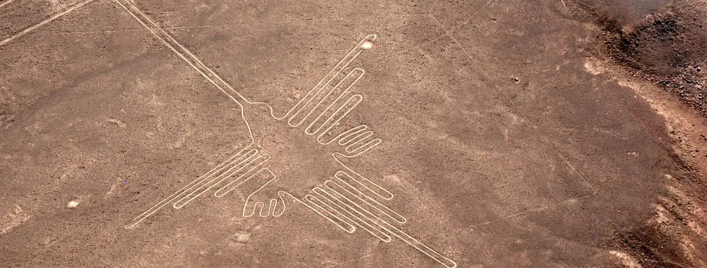 This giant hummingbird, stretching over 300 feet! It’s one of the most famous Nasca Geoglyphs. There are also other cool ones like a monkey, killer whale, spider, and condor. And it’s not just animals—there are plants, shapes like spirals and zigzags, and lines crisscrossing the desert plain called the Pampa.